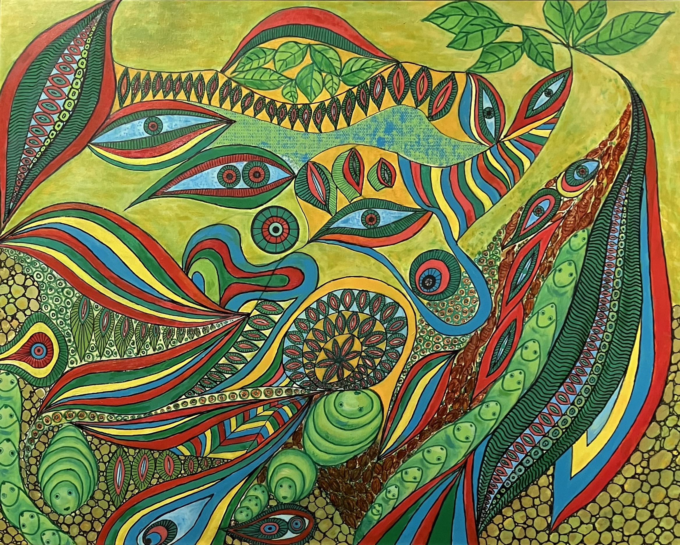 それで無意識のうちにこれに代わるものとして人間が生み出し、織りなす美と詩情を画布の上に表現しているであろうが、自ずと筆が走るという不思議な体験をして、健聴者の味わう音の世界とはこうもあろうかと感じた。