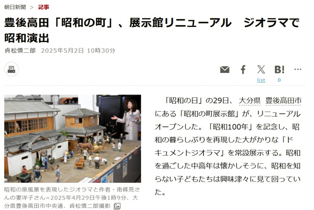 | 2025年5月2日 | 昭和の町展示館が朝日新聞に掲載 朝日新聞記事『豊後高田「昭和の町」、展示館リニューアル ジオラマで昭和演出』へ |