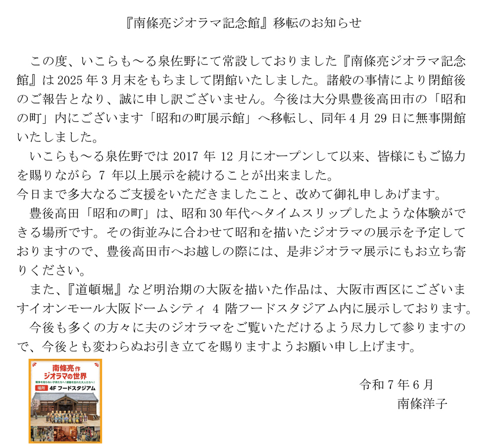 | 2025年4月29日 | いこらも~る泉佐野常設展示場から昭和の町展示館に移転 |