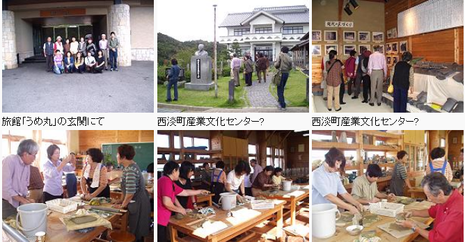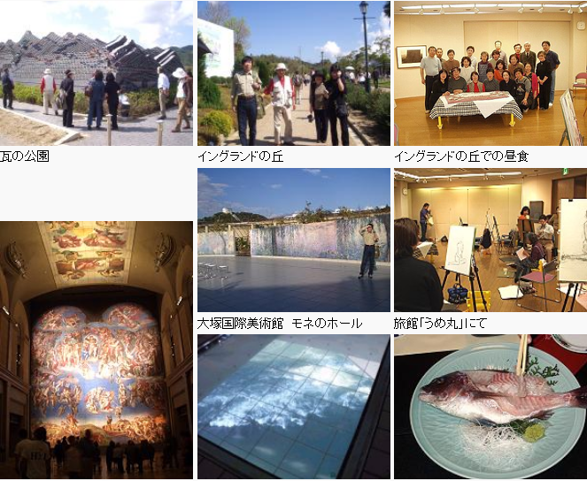 一日目は、西淡.三原ICで高速道路を下り「瓦の公園」「イングランドの丘」を経て、鳴門海峡を渡った後「大塚国際美術館」鑑賞班とスケッチ班の2グループに分かれました。 大塚国際美術館では、古代ポンペイの壁画からピカソのゲルニカなどの現代絵画まで、1071点もの陶板名画を鑑賞。展示品はオリジナル作品と同寸で額縁まで同じもの。鳴門で世界中の美術館を巡っているようで、特にシスティナ礼拝堂の天井画と壁画が再現されたシステイナ・ホールでは、バチカンの礼拝堂にいるような錯角すら覚えました。 その後合流し、歩いて鳴門大橋の中程(丁度大渦の真上、45mの高さ)から満潮の渦を見学。再び淡路島に戻って、宿の「うめ丸」で温泉に入り、夜は鯛尽くしの料理を堪能しました。 二日目は、「魚彩館」で新鮮な魚を買った後「西淡町産業文化センター」で瓦粘土の造型実習を楽しみ、そして今回メインの、中央鬼瓦工業所他で「プレス瓦、平瓦、鬼瓦」の制作現場を見学。古い瓦、地震対策の新しい瓦、そして瓦材を使った新しい作品などに興味は尽きませんでした。最後に行ったのは、日本南画界の第一人者、直原玉青画伯の作品を集めた「玉青館」。午後6時近く、夕日が美しい明石大橋を渡り帰路につきました。 好天に恵まれ、楽しい経験と美味しい料理に舌鼓を打った今回の見学会は、皆さんのよい想い出として残るものと思います。 終わりに、今回の「淡路島の瓦工場見学会」でいろいろお世話いただいた大阪支部の福原睦郎氏に心から感謝を申し上げます。 (世話人 栗原逸平記)