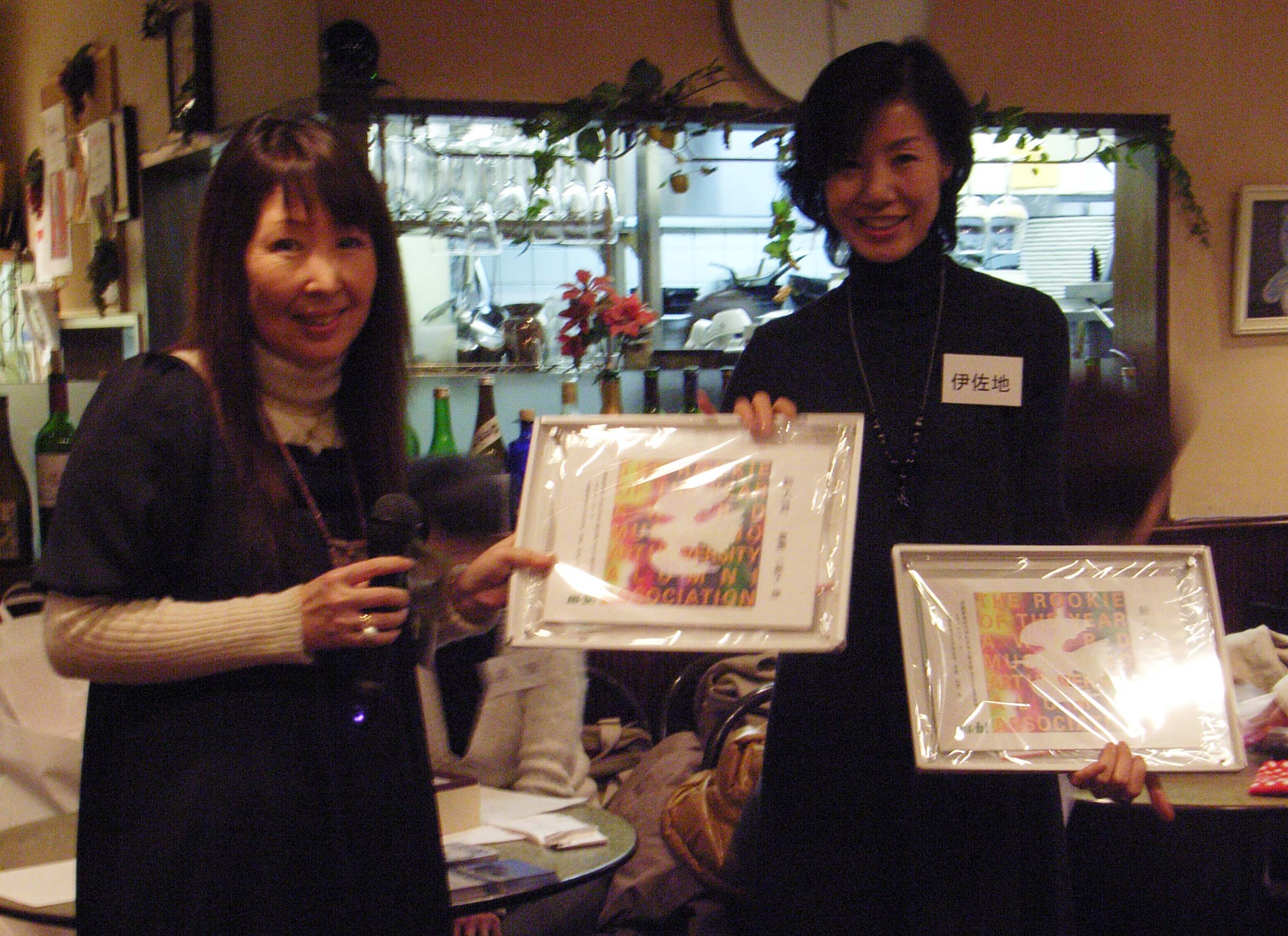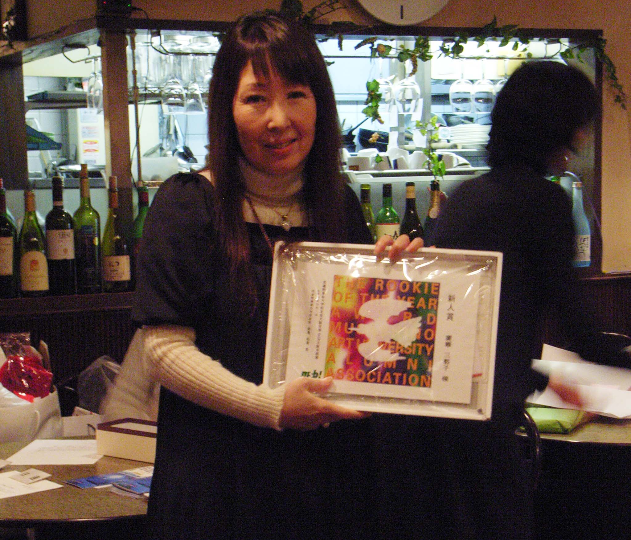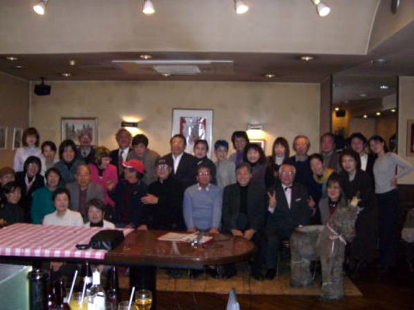寒い雨の夜にもかかわらず32名の皆様に参加して頂きました。 支部長の挨拶におきまして、今年10月武蔵野美術大学主催による地域ホーラム「アート&デザイン2008ー大阪」の開催が決定したとの報告があり、大阪支部全員で協力してアートフォーラムを成功さ せましょう!との全員一致の大きな盛り上がりから新年会がスタートしました。 つづいて、昨年の支部展での新人賞の授賞式があり本部から、広瀬さん、伊佐地さん、駒井さん(欠席)3人の方へ新人賞が授与されました。また、大阪支部会員の方々の為にご尽力くださった、岸野さん、山木さんに支部長より感謝状と記念品の贈呈がありました。 会員でシャンソン歌手の大年さんの歌を楽しみ、また美味しい食事と懇談、アドリブいっぱいのスピーチ昨年活躍された厳さんのDVDでの活動報告、プレゼント交換、などなど、楽しい時間と空間を共有できたステキな新年会になりました。皆様有難うございました。今年も宜しくお願いします。 <新年会係り 寺島 真里子>