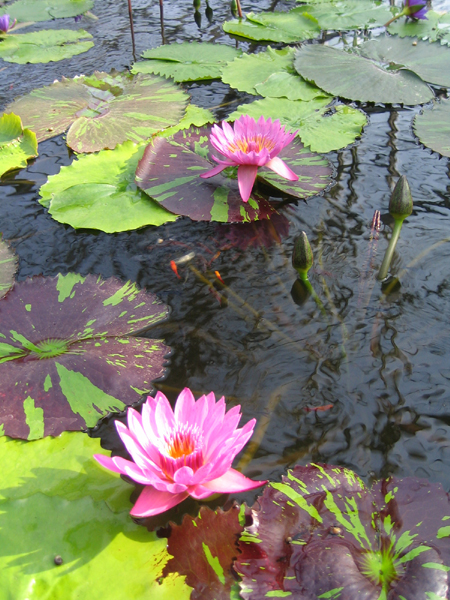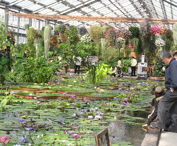 暖かい園内では、花々が空中に咲き乱れ、水辺には多種多様な睡蓮が水面いっぱいに