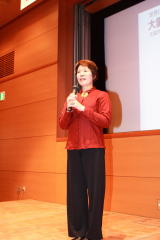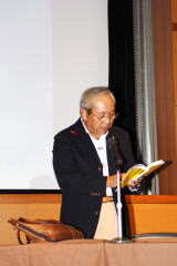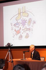オルファーカッターの創案者岡田三朗氏は、幼い頃からの思い出を辿りながら自然の恵みの有り難さを説かれ、カッターナイフ発案から商品に至るまでの苦労話、そしてとことんやり通す事の大切さを熱く語られ、ご自身の作画による微笑ましい絵を映しながら講演された。又おもちゃの世界から紙のコマの回転によって生まれる色彩アートが世界中に広がって行く楽しさを紹介された。